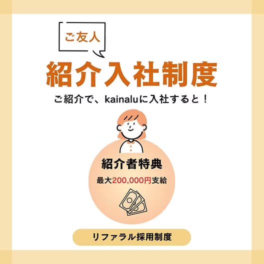 kainaluは、社員一人ひとりの力と、そこから広がるネットワークが会社の成長に不可欠だと考えています。そのため、社員が自身の友人や知人といった優秀な人材を会社に紹介し、その方が新しい仲間として加わった際に紹介手当を支給する「従業員紹介制度(友人紹介入社制度/リファラル採用制度)」を設けています 。